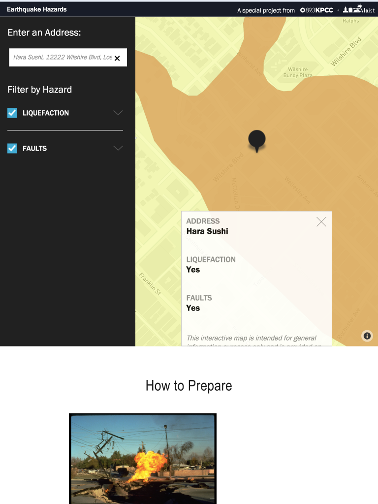 The Big One needed a way to help SoCal residents prepare for the anticipated big earthquake. We created a responsive map that allowed users to easily figure out whether they lived on a liquefaction or fault zone. We then plotted the data onto a map with Mapbox and created custom controls using Mapbox’s API.